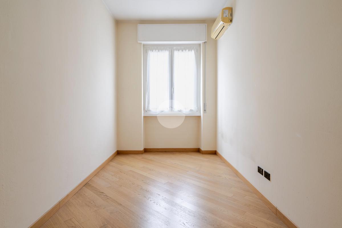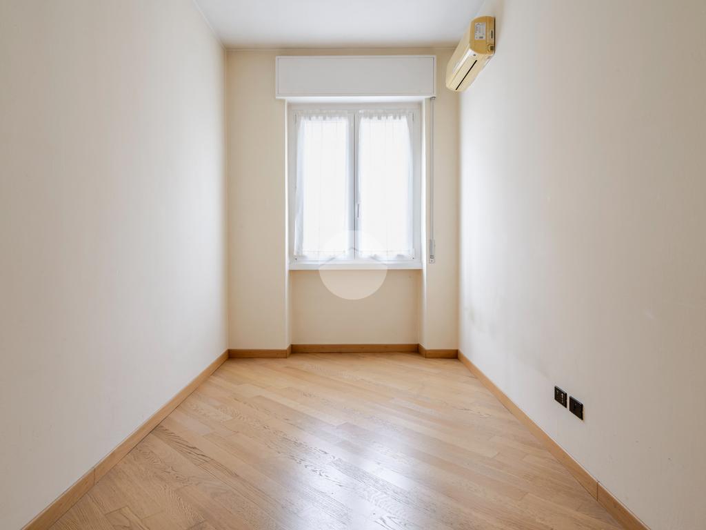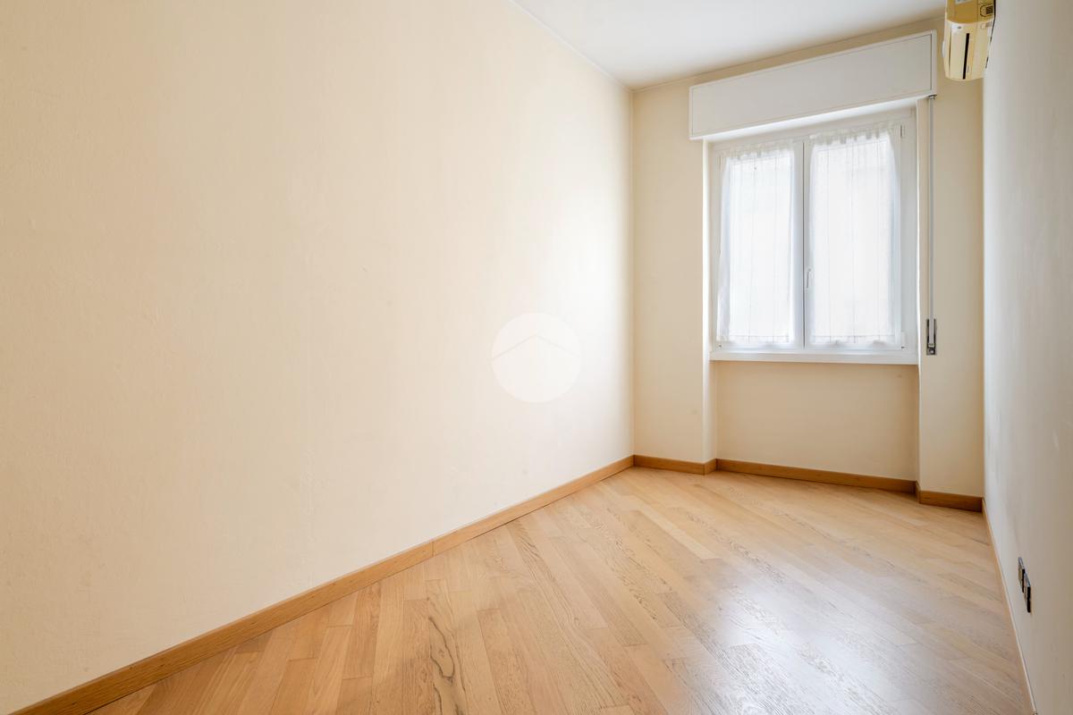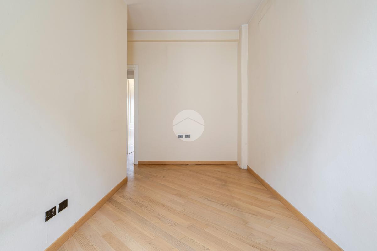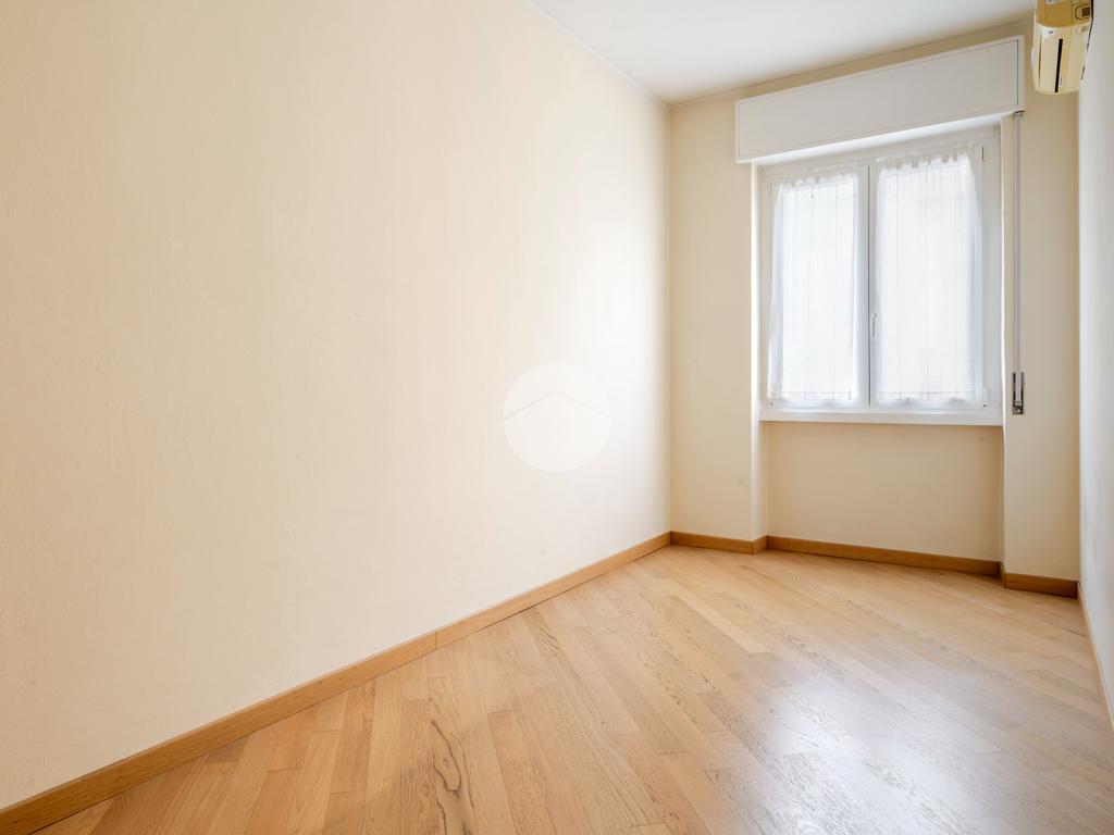 Ingresso in ampio disimpegno che si apre subito nell’ampia e luminosa zona living con moderna cucina a vista e doppia porta finestra che ci consente l’accesso al balcone con piacevole affaccio su Via Alunno. A seguire tramite il disimpegno accediamo alla zona notte dove, con medesima esposizione della zona living, troviamo la camera singola, mentre con esposizione contraria, quindi con silenzioso affaccio su corte interna, troviamo la camera matrimoniale con balcone e infine il bagno finestrato con vasca.