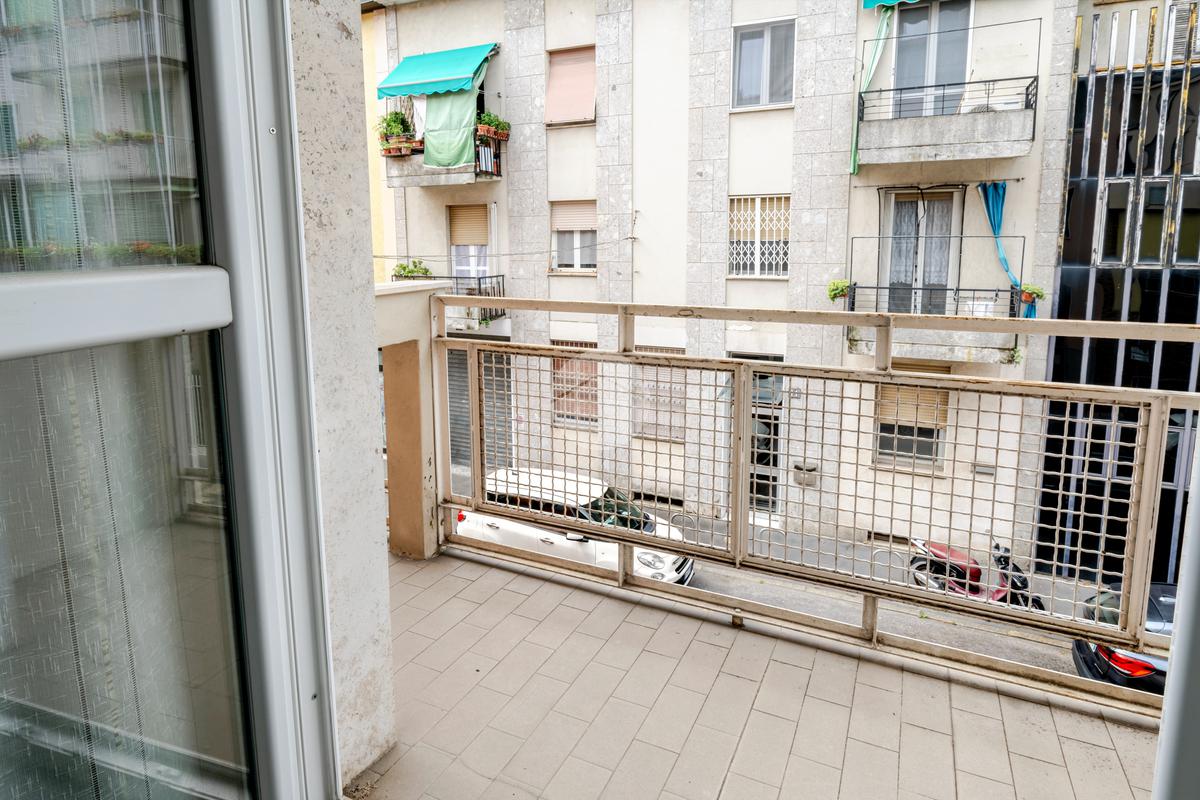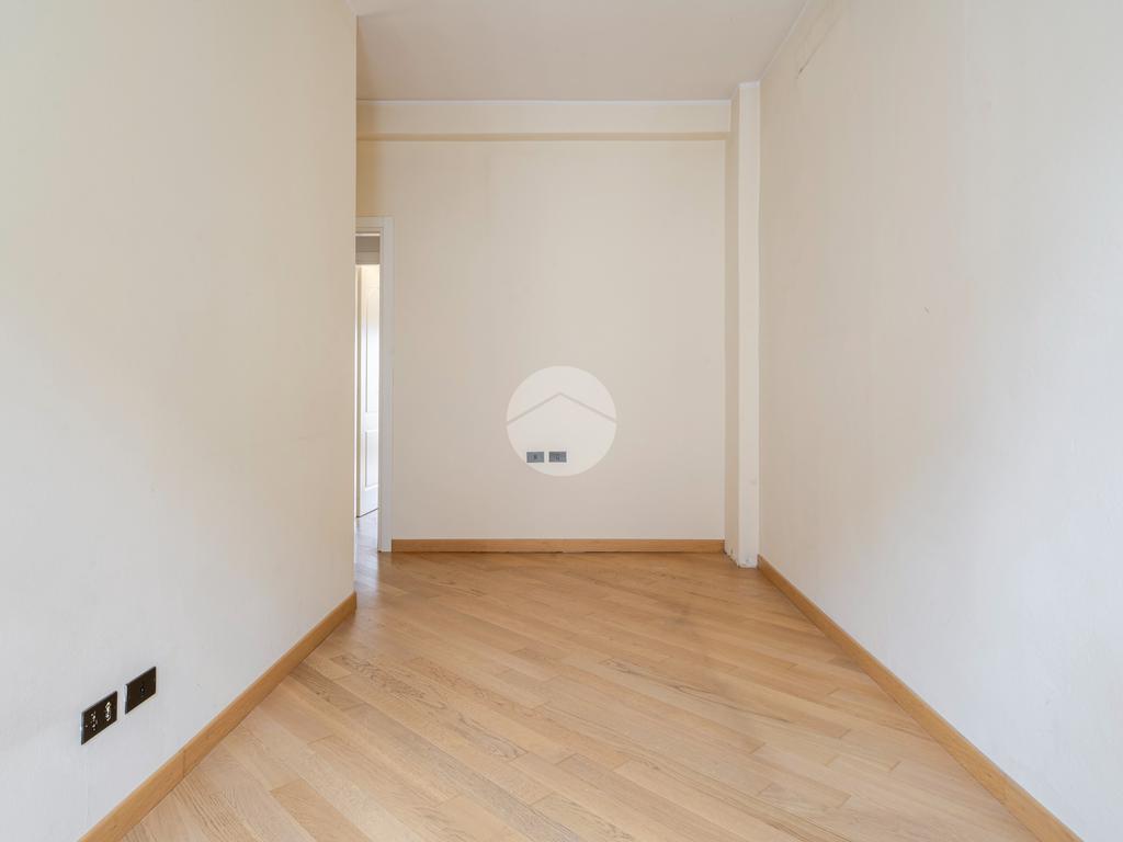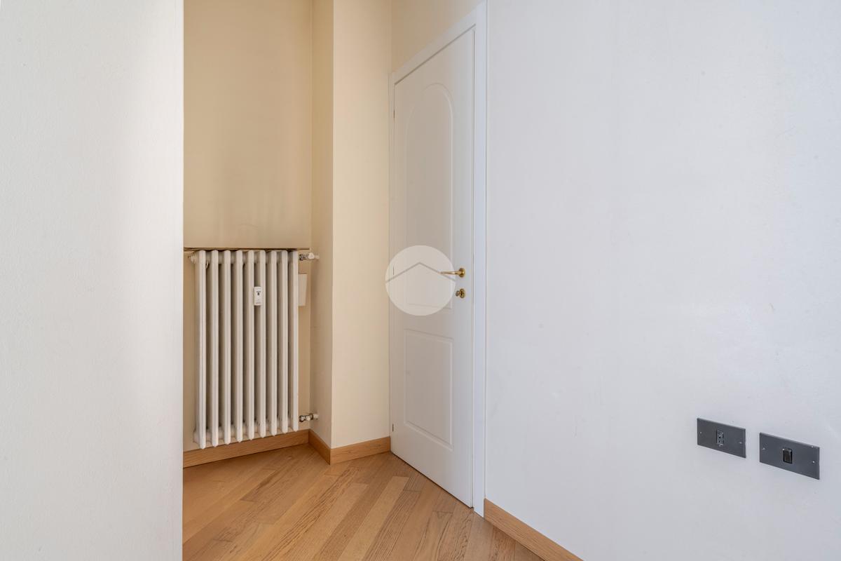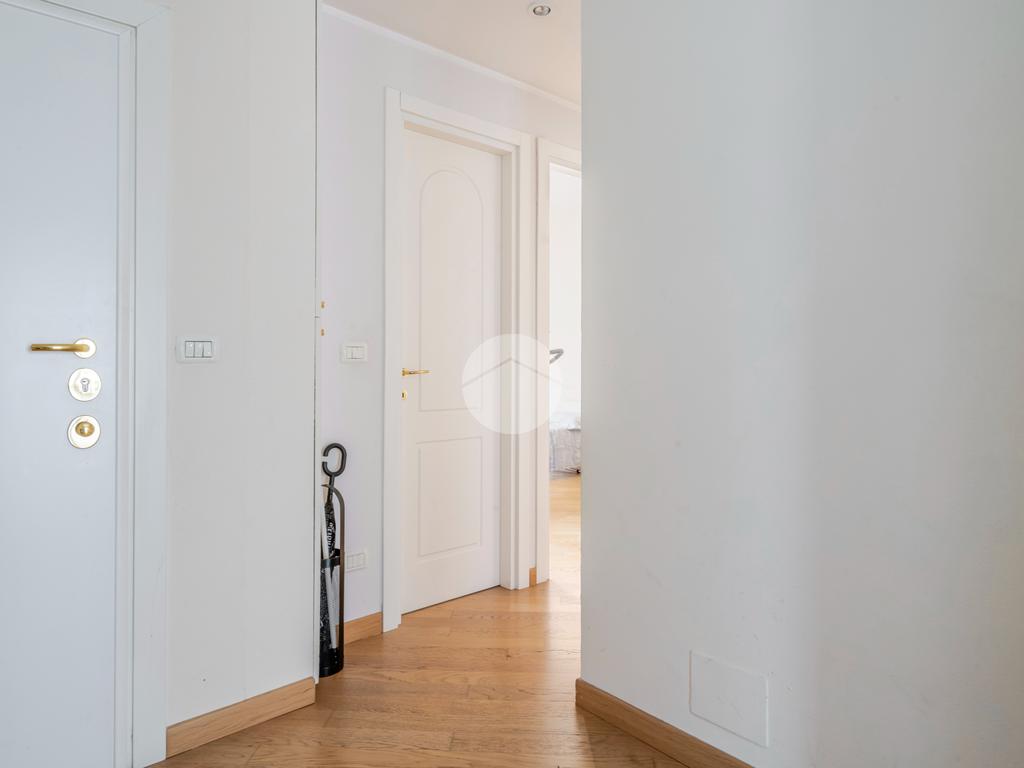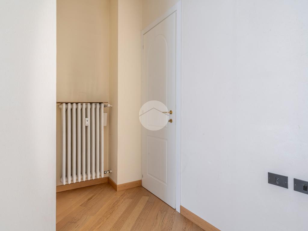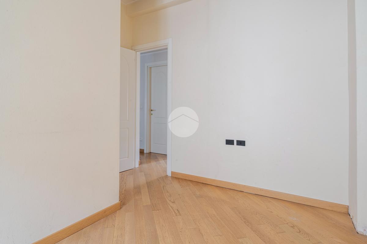 Ingresso in ampio disimpegno che si apre subito nell’ampia e luminosa zona living con moderna cucina a vista e doppia porta finestra che ci consente l’accesso al balcone con piacevole affaccio su Via Alunno. A seguire tramite il disimpegno accediamo alla zona notte dove, con medesima esposizione della zona living, troviamo la camera singola, mentre con esposizione contraria, quindi con silenzioso affaccio su corte interna, troviamo la camera matrimoniale con balcone e infine il bagno finestrato con vasca.