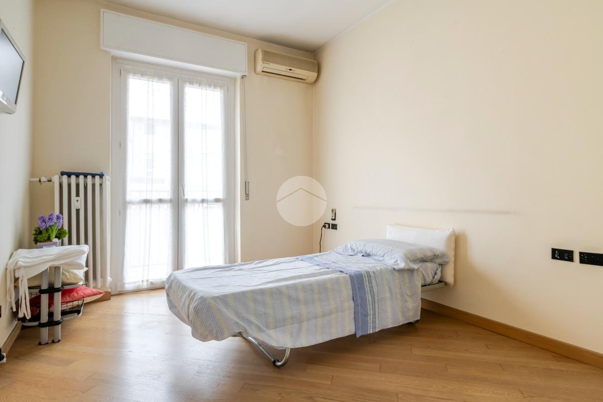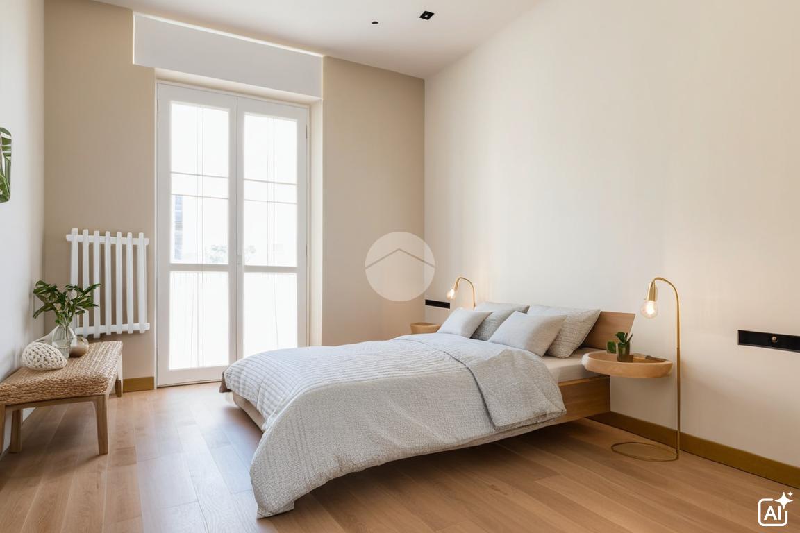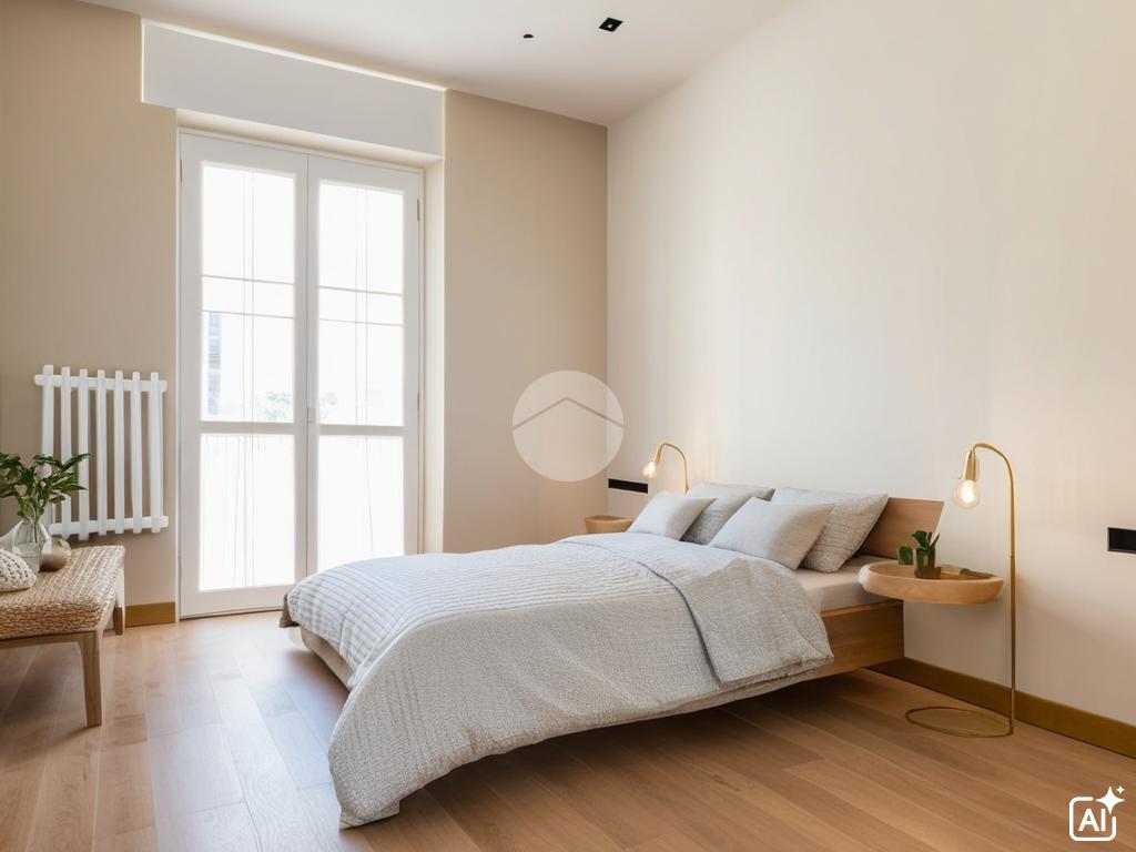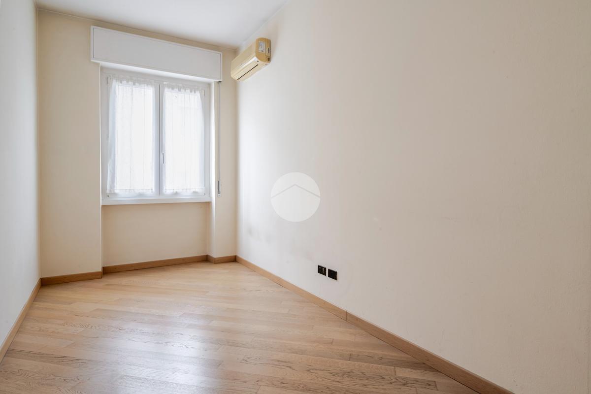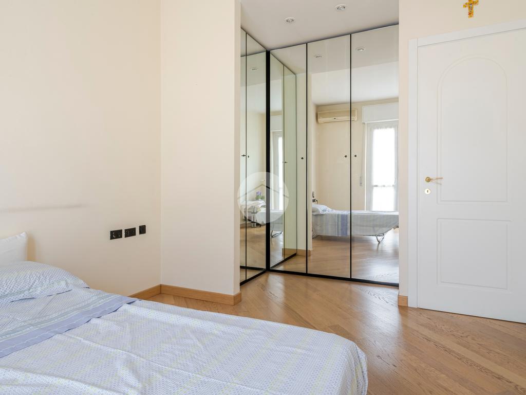 Ingresso in ampio disimpegno che si apre subito nell’ampia e luminosa zona living con moderna cucina a vista e doppia porta finestra che ci consente l’accesso al balcone con piacevole affaccio su Via Alunno. A seguire tramite il disimpegno accediamo alla zona notte dove, con medesima esposizione della zona living, troviamo la camera singola, mentre con esposizione contraria, quindi con silenzioso affaccio su corte interna, troviamo la camera matrimoniale con balcone e infine il bagno finestrato con vasca.