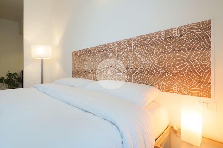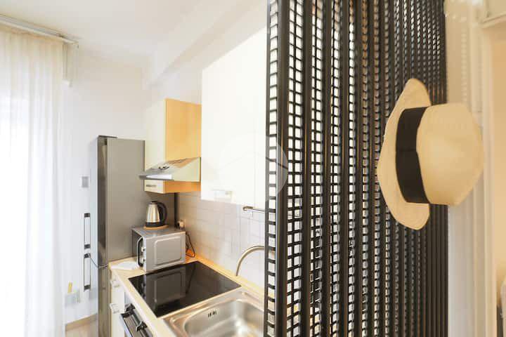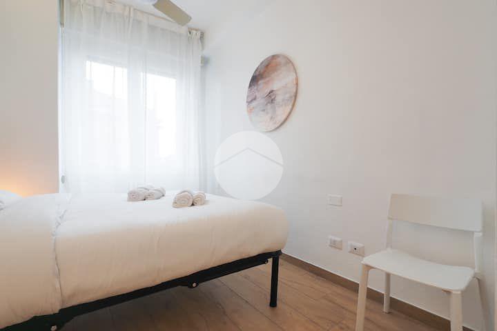 A sinistra rispetto l’ingresso accediamo all’ampia e luminosa zona living con cucina a vista e porta finestra che ci consente l’accesso al balcone abitabile con piacevole affaccio su corte interna. La zona living, grazie alle sue dimensioni generose, ospita un comodo divano trasformabile in letto matrimoniale, ideale per accogliere ospiti o creare un’ulteriore soluzione notte all’occorrenza. A seguire troviamo la luminosa camera matrimoniale con medesima esposizione della zona giorno. Infine, bagno finestrato con ampio box doccia in vetro cristallo.