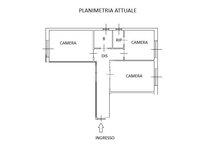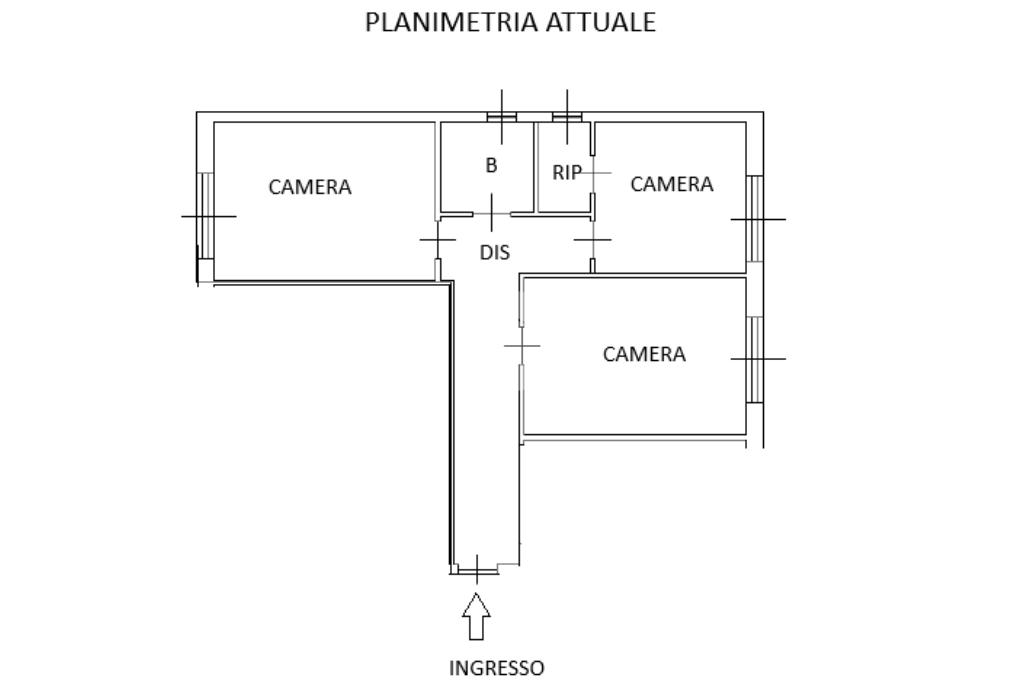 L’appartamento si presenta attualmente con la seguente distribuzione: ingresso in ampio corridoio che ci conduce direttamente alle tre camere da letto matrimoniali, bagno finestrato e infine comodo ripostiglio/cabina armadio in una delle camere.