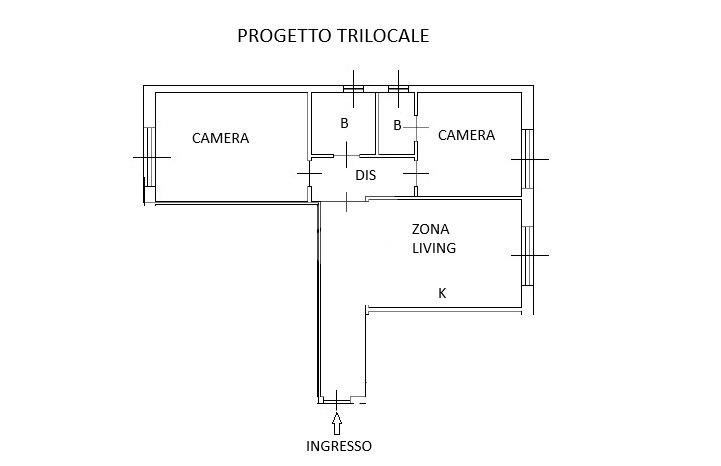 Grazie alla disposizione interna e alla struttura dell’appartamento, è possibile ipotizzare una diversa distribuzione degli ambienti (come da planimetria di progetto), con ingresso in corridoio che consente l’accesso sulla zona living con cucina a vista, due ampie camere matrimoniali, una delle quali con cabina armadio o secondo bagno, e infine bagno finestrato. Questa soluzione consentirebbe di realizzare un moderno e funzionale trilocale.