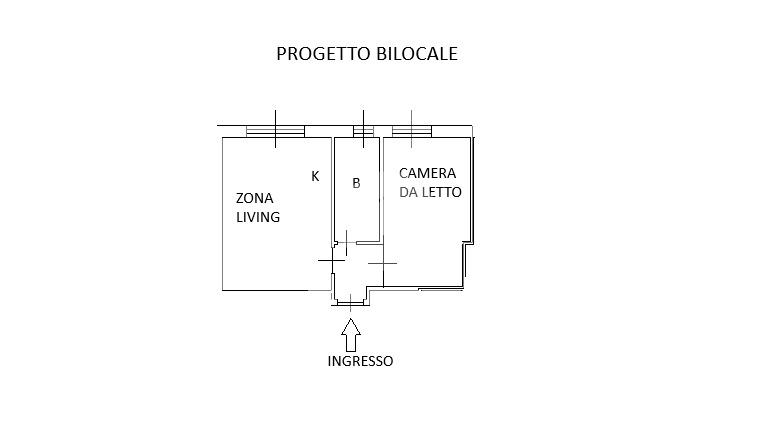 Grazie alla disposizione interna e alla struttura dell’appartamento, è possibile ipotizzare una diversa distribuzione degli ambienti (come da planimetria di progetto), con ingresso in disimpegno che consente l’accesso sulla zona living con cucina a vista, bagno finestrato e ampia camera da letto separata. Questa soluzione consentirebbe di realizzare un moderno bilocale, ottimizzando gli spazi e valorizzando la zona giorno in chiave contemporanea.