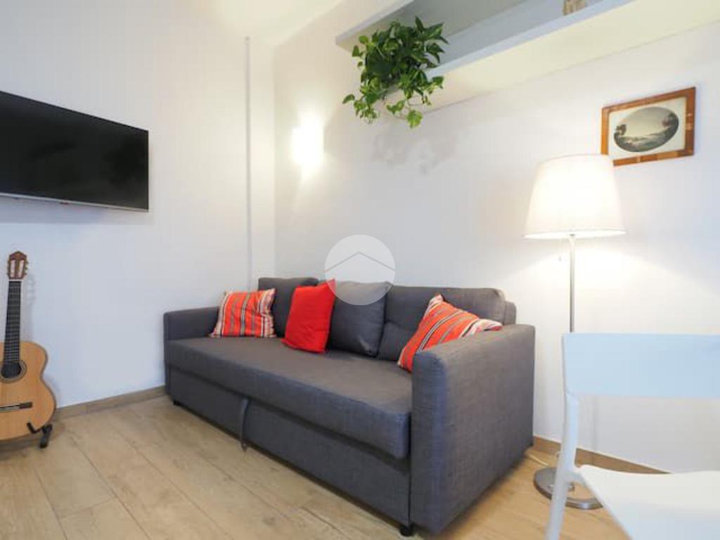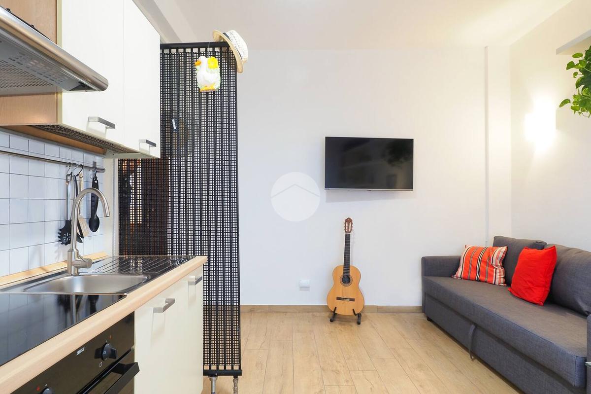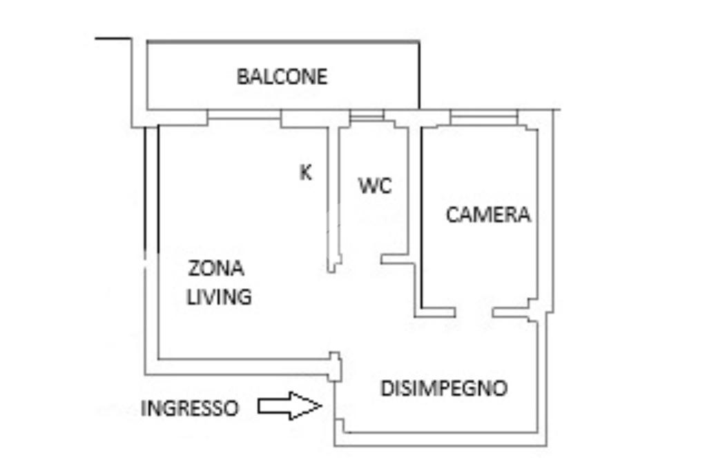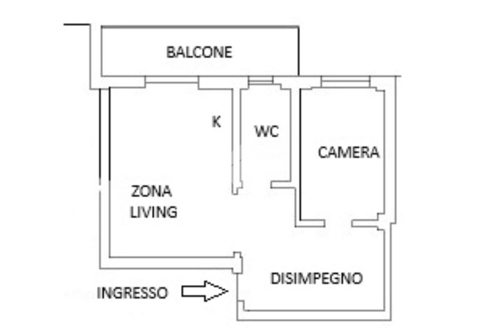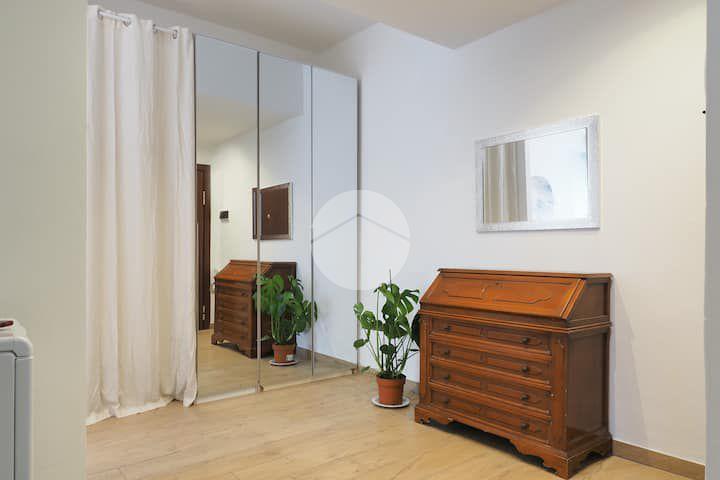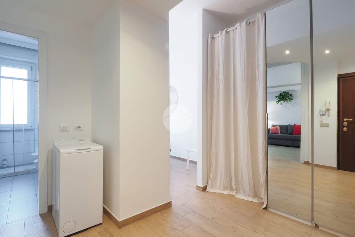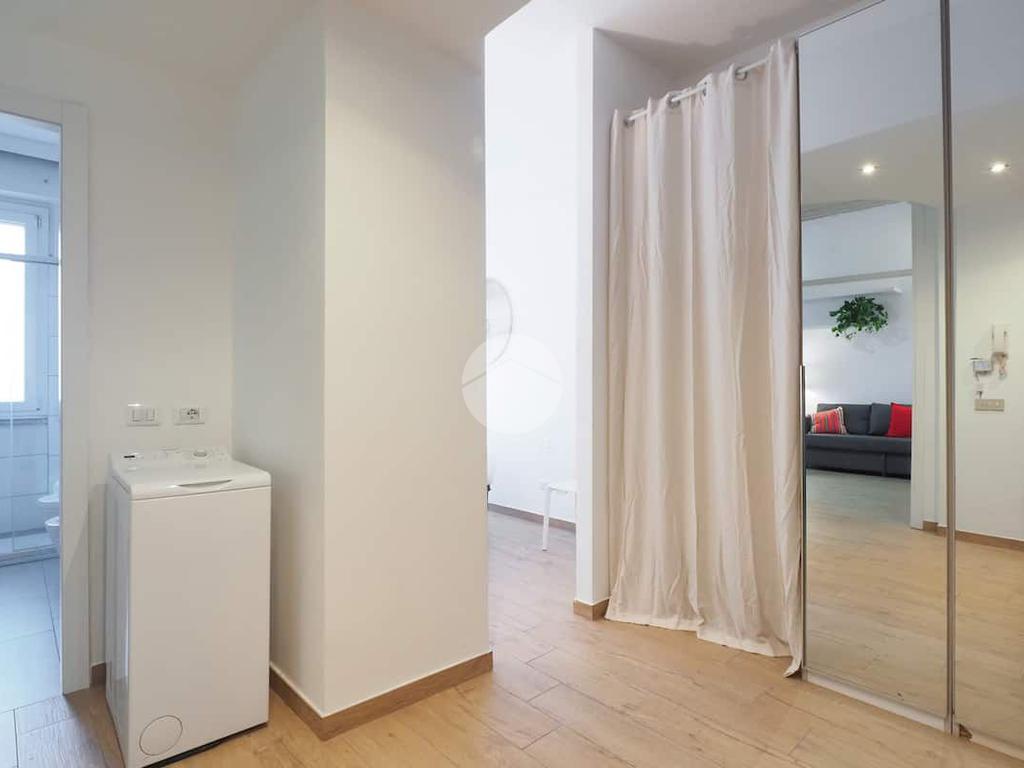 Ingresso in ampio disimpegno nel quale è stata ricavata un'ampia armadiatura a tutta parete comoda come guardaroba aggiuntivo o per organizzare al meglio lo spazio domestico. A sinistra rispetto l'ingresso accediamo all'ampia e luminosa zona living con cucina a vista e porta finestra che ci consente l'accesso al balcone abitabile con piacevole affaccio su corte interna. La zona living, grazie alle sue dimensioni generose, ospita un comodo divano trasformabile in letto matrimoniale, ideale per accogliere ospiti o creare un'ulteriore soluzione notte all'occorrenza. A seguire troviamo la luminosa camera matrimoniale con medesima esposizione della zona giorno. Infine, bagno finestrato con ampio box doccia in vetro cristallo.