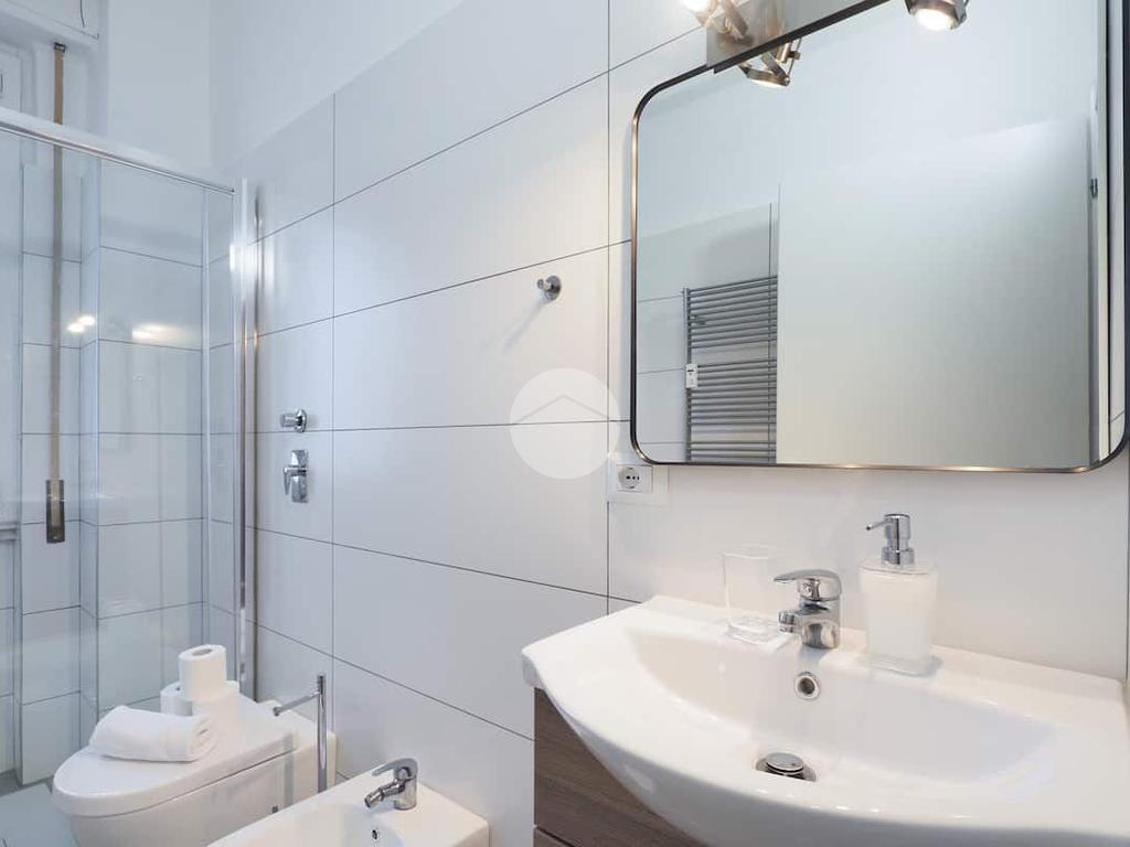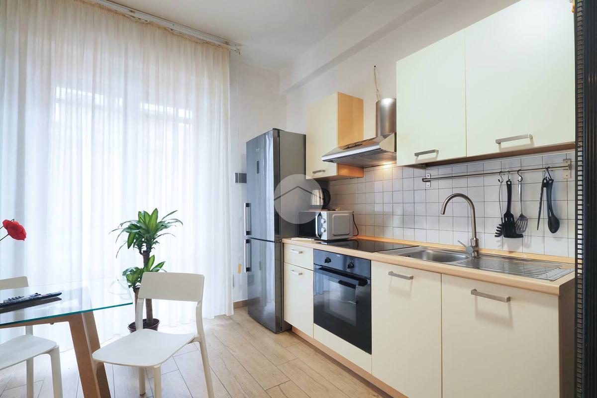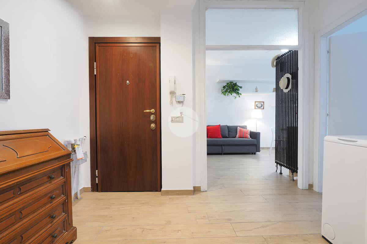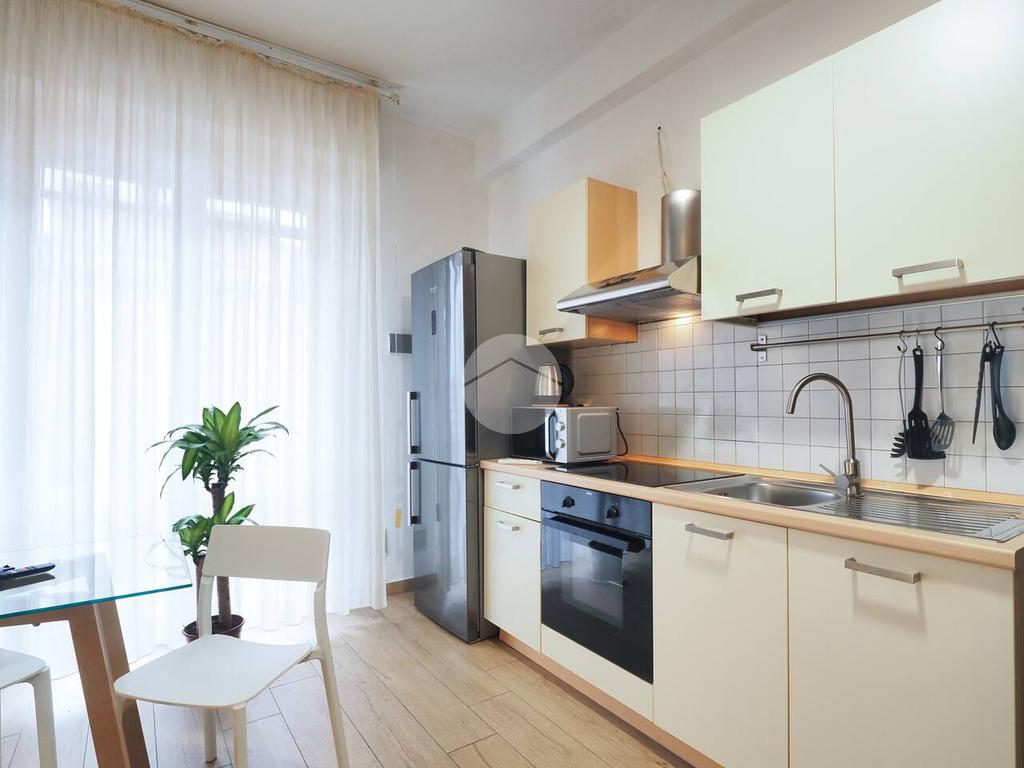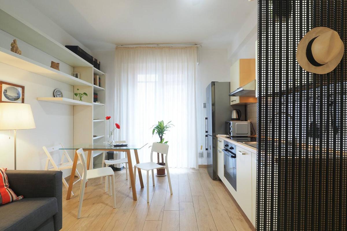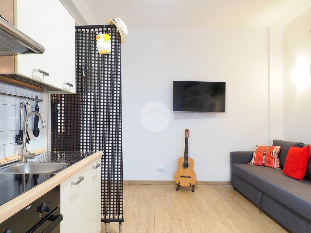 Ingresso in ampio disimpegno nel quale è stata ricavata un'ampia armadiatura a tutta parete comoda come guardaroba aggiuntivo o per organizzare al meglio lo spazio domestico. A sinistra rispetto l'ingresso accediamo all'ampia e luminosa zona living con cucina a vista e porta finestra che ci consente l'accesso al balcone abitabile con piacevole affaccio su corte interna. La zona living, grazie alle sue dimensioni generose, ospita un comodo divano trasformabile in letto matrimoniale, ideale per accogliere ospiti o creare un'ulteriore soluzione notte all'occorrenza. A seguire troviamo la luminosa camera matrimoniale con medesima esposizione della zona giorno. Infine, bagno finestrato con ampio box doccia in vetro cristallo.