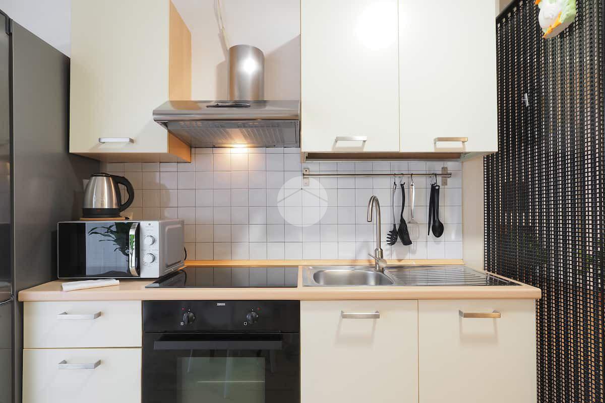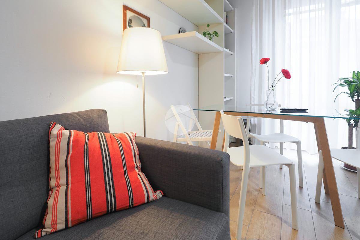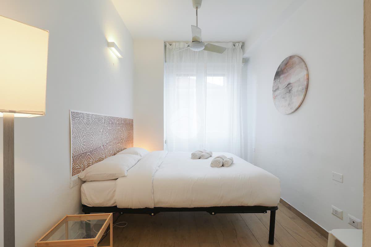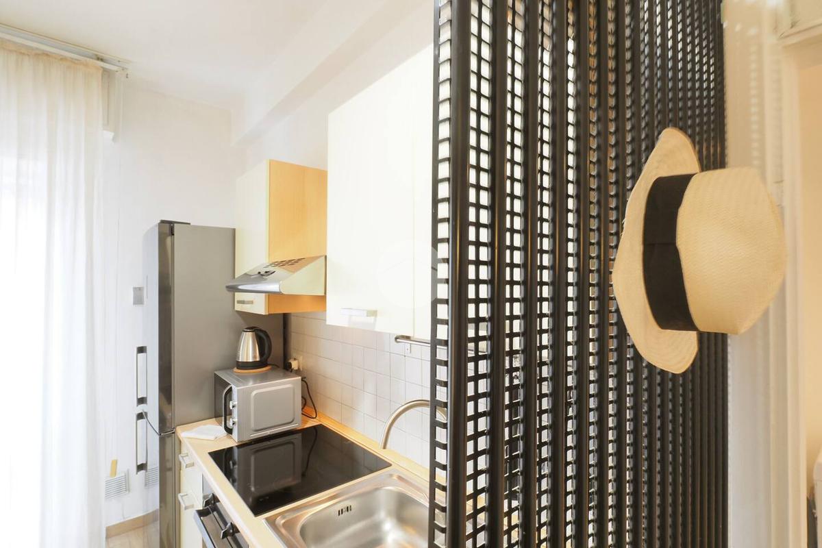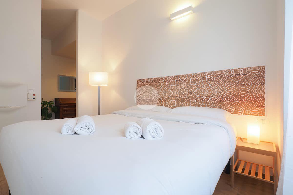 Ingresso in ampio disimpegno nel quale è stata ricavata un'ampia armadiatura a tutta parete comoda come guardaroba aggiuntivo o per organizzare al meglio lo spazio domestico. A sinistra rispetto l'ingresso accediamo all'ampia e luminosa zona living con cucina a vista e porta finestra che ci consente l'accesso al balcone abitabile con piacevole affaccio su corte interna. La zona living, grazie alle sue dimensioni generose, ospita un comodo divano trasformabile in letto matrimoniale, ideale per accogliere ospiti o creare un'ulteriore soluzione notte all'occorrenza. A seguire troviamo la luminosa camera matrimoniale con medesima esposizione della zona giorno. Infine, bagno finestrato con ampio box doccia in vetro cristallo.