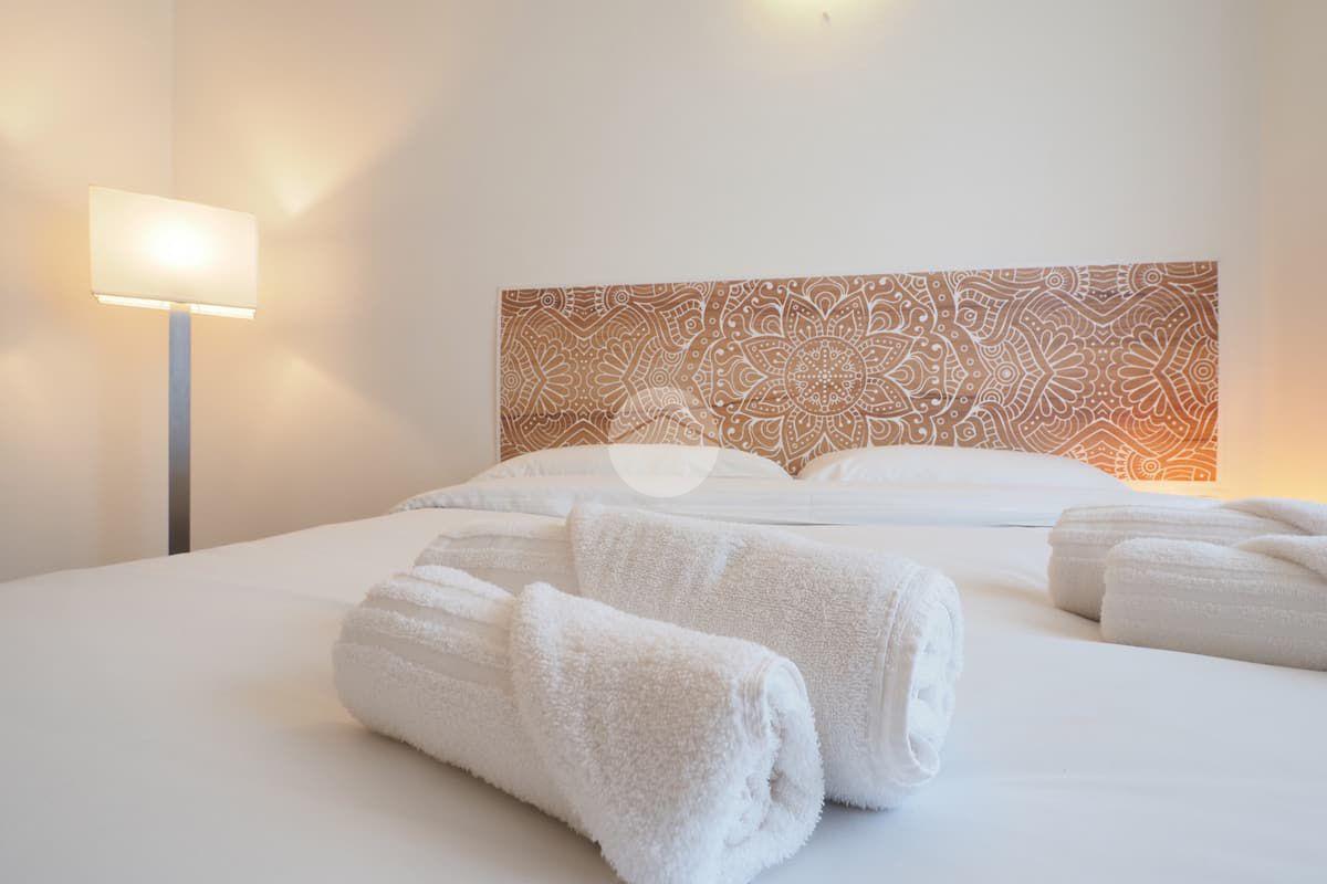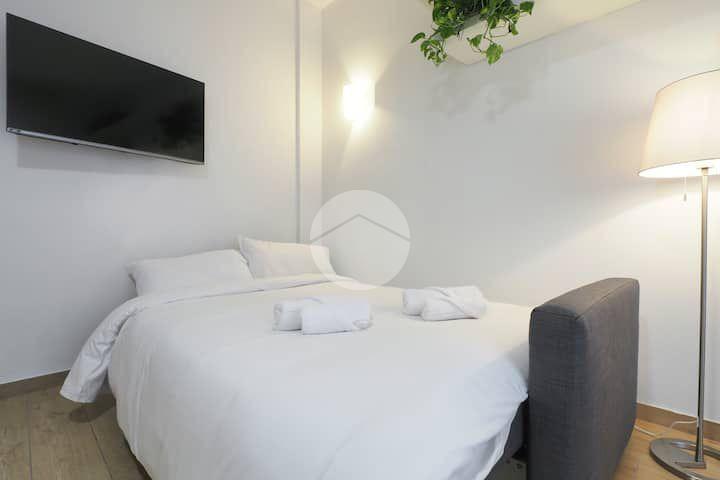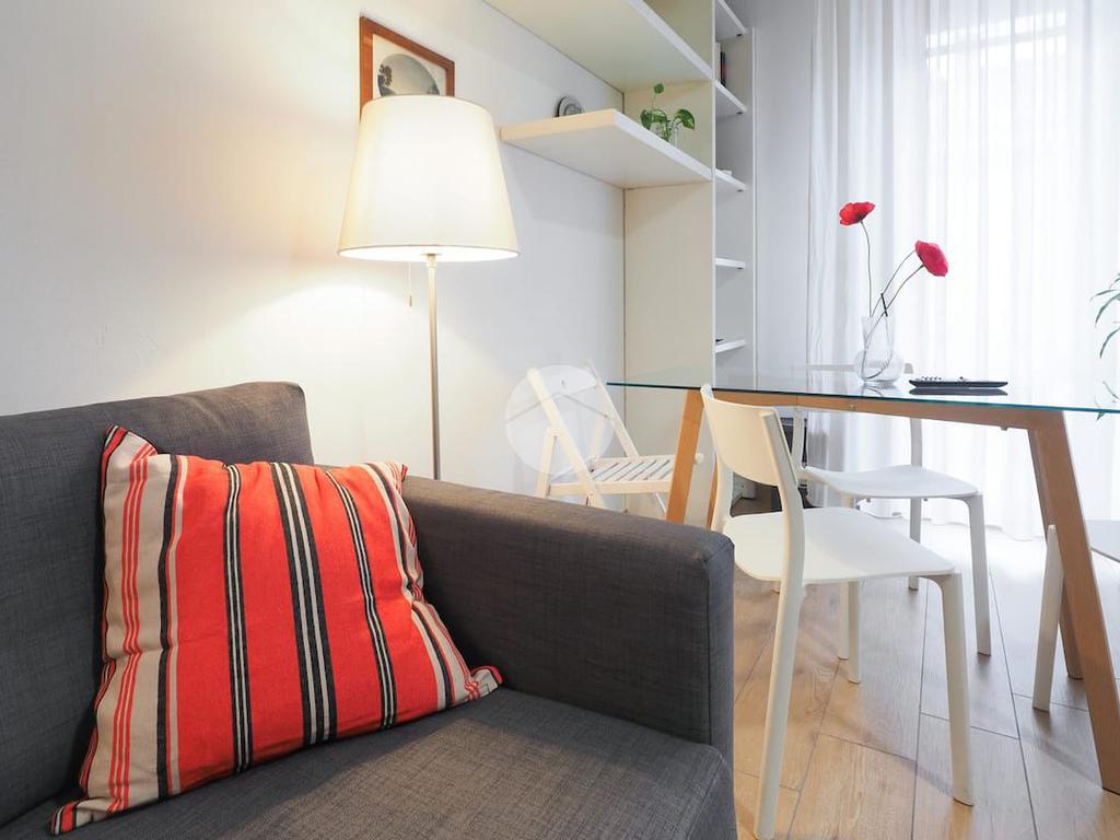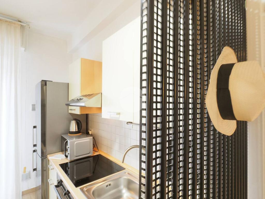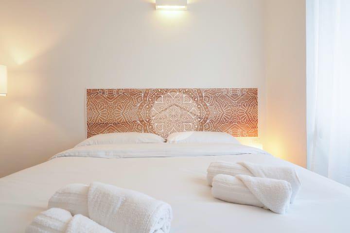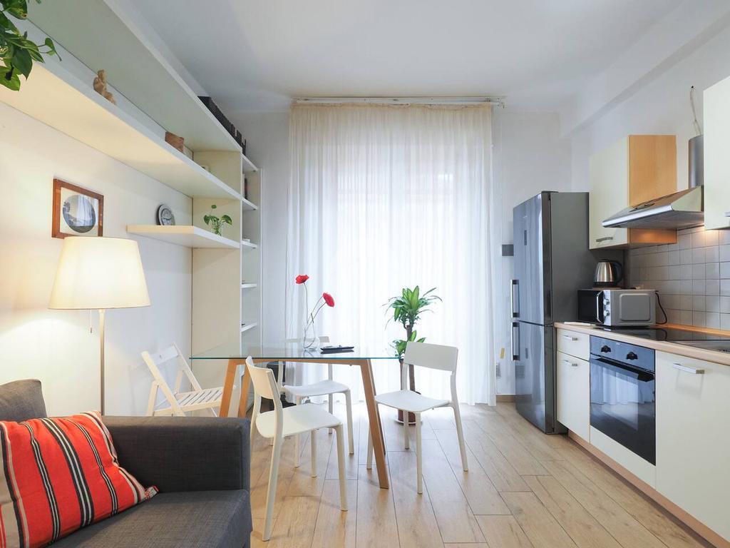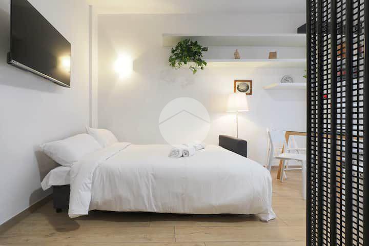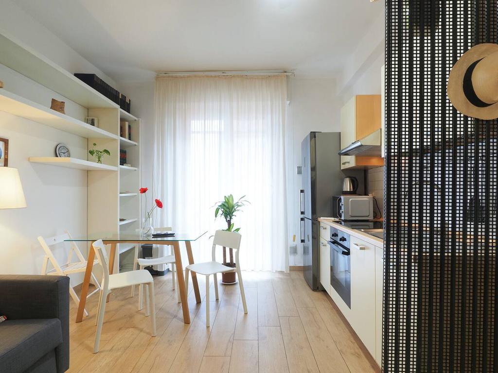 Ingresso in ampio disimpegno nel quale è stata ricavata un'ampia armadiatura a tutta parete comoda come guardaroba aggiuntivo o per organizzare al meglio lo spazio domestico. A sinistra rispetto l'ingresso accediamo all'ampia e luminosa zona living con cucina a vista e porta finestra che ci consente l'accesso al balcone abitabile con piacevole affaccio su corte interna. La zona living, grazie alle sue dimensioni generose, ospita un comodo divano trasformabile in letto matrimoniale, ideale per accogliere ospiti o creare un'ulteriore soluzione notte all'occorrenza. A seguire troviamo la luminosa camera matrimoniale con medesima esposizione della zona giorno. Infine, bagno finestrato con ampio box doccia in vetro cristallo.